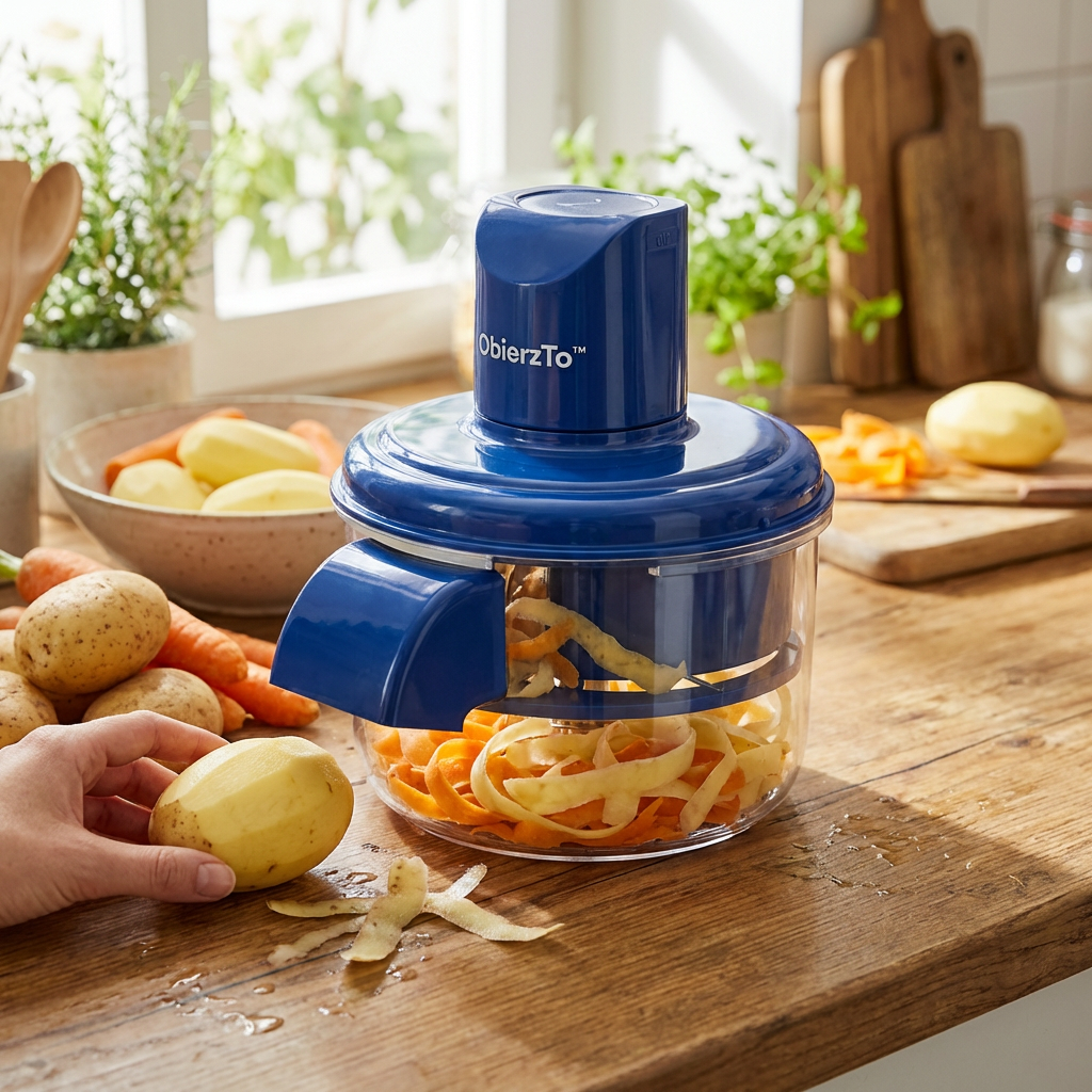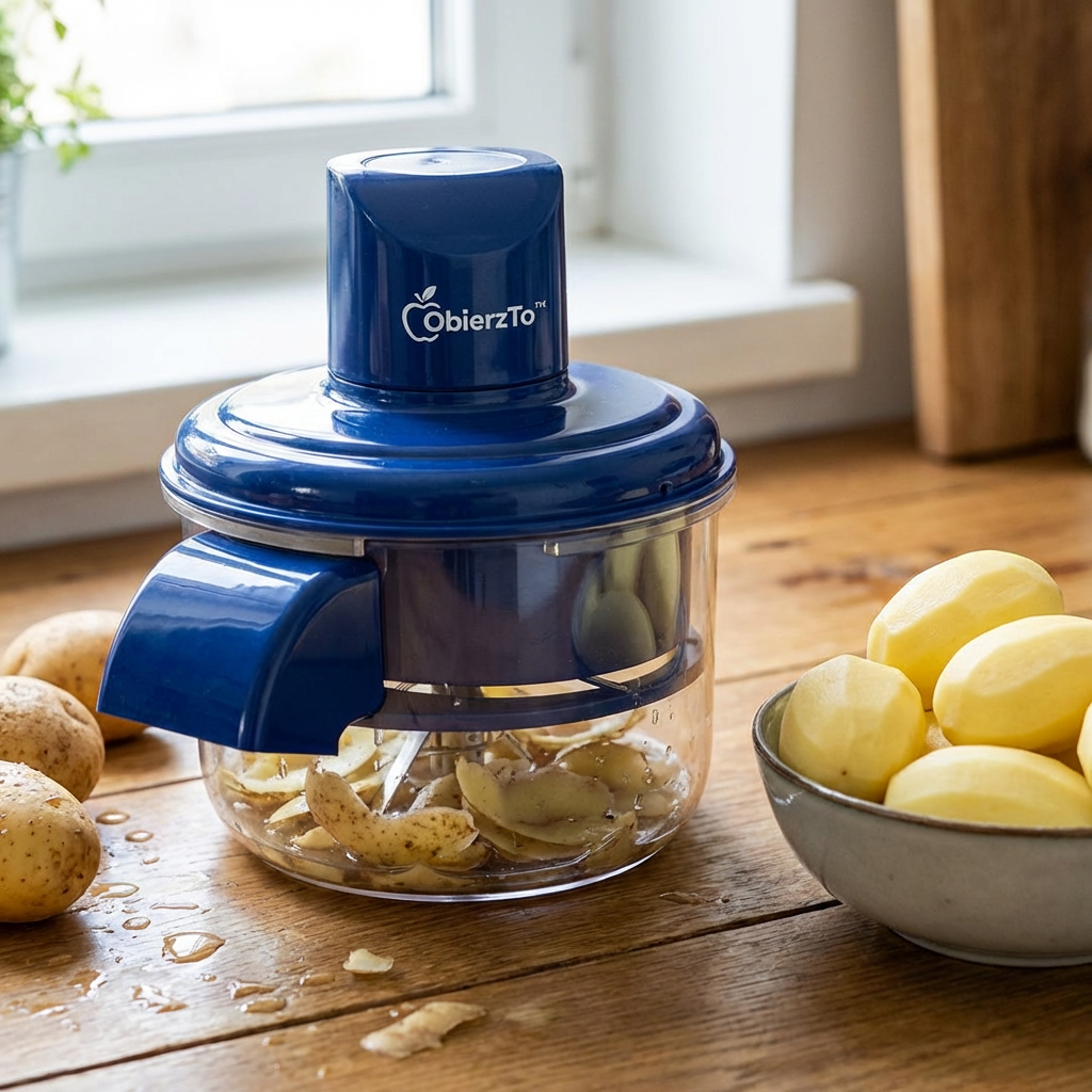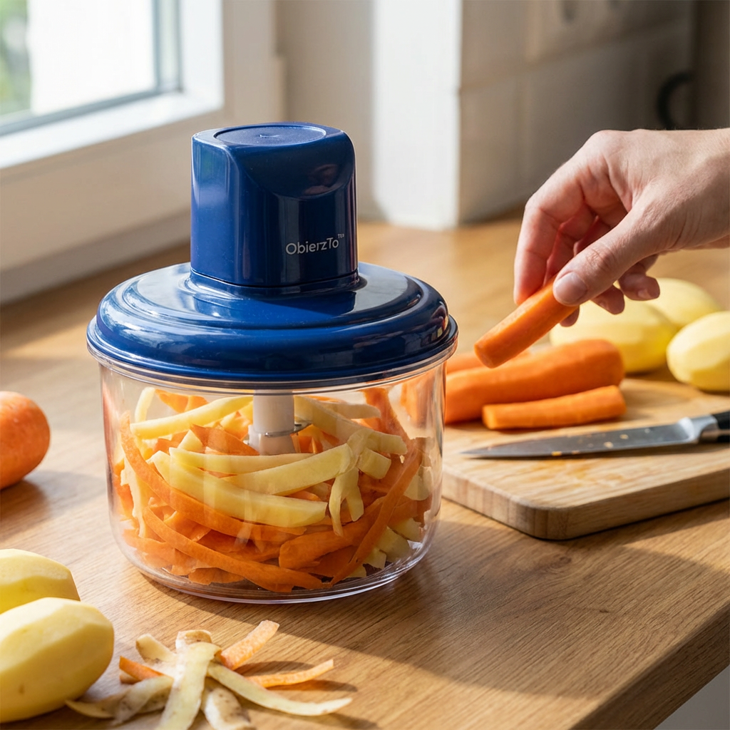 ObierzTo™ to nowoczesna obieraczka, która upraszcza codzienne przygotowywanie warzyw. Wystarczy włożyć je do środka, a urządzenie zajmie się resztą — sprawnie, estetycznie i bez bałaganu na blacie.